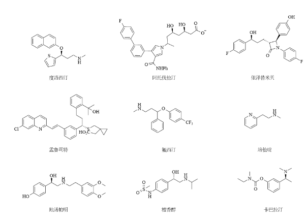 图1.以手性醇为主要中间体的手性药物化学结构式[4,5]