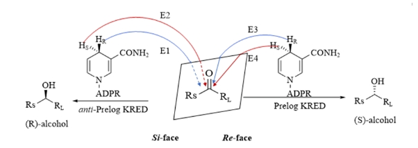 该过程中,产物的构型由辅酶上氢原子的传递模式(E1-E4)决定(见图2)。底物羰基C属于sp2杂化,呈平面结构,其平面前侧为re-(re-face),后侧为si-面(si-face)。当H从si-面进攻羰基碳原子时(E1, E2模式)时,反应遵循anti-Prelog规则,产生R构型产物。而当H从re-面进攻羰基碳原子时(E3, E4模式)时,反应遵循Prelog规则,产生S构型产物。